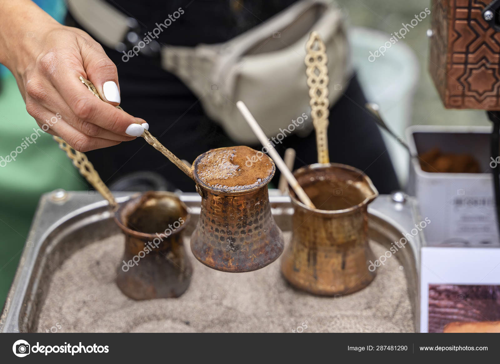 Hands Of Girl Making Traditional Turkish Coffee With Foam In Copper Turk On Hot Sand Coffee Preparation Concept Stock Photo By C Svetlanais 287481290